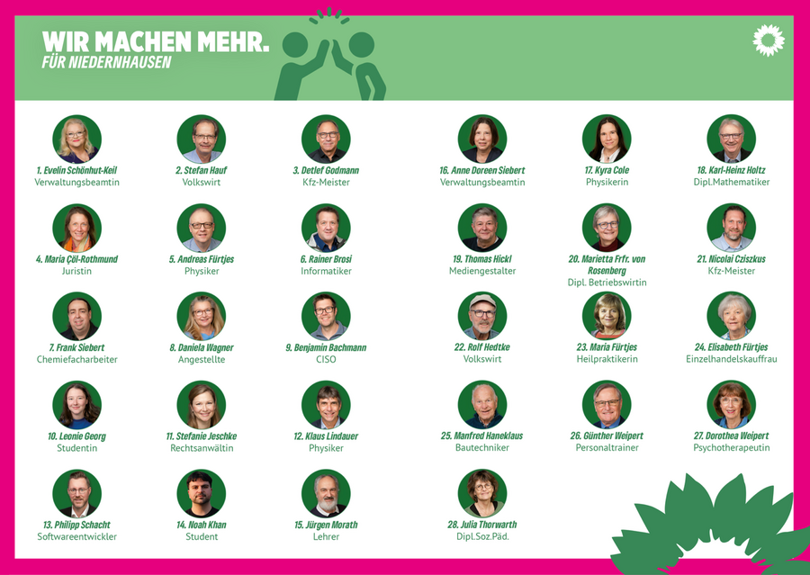 "Vor meinem Umzug nach Niedernhausen, hatte ich verschiedene politische Funktionen auf Grüner Landesebene inne. Meine Erfahrungen in der Gemeindevertretung einbringen zu können und inhaltliche Schwerpunkte für ein lebenswerteres, soziales und klimafreundliches Niedernhausen zu verfolgen, würde mir Freude bereiten. Deshalb hoffe ich darauf, in der Gemeindevertretung tätig sein zu dürfen und freue mich auf eine Zusammenarbeit in einem gutem Team."