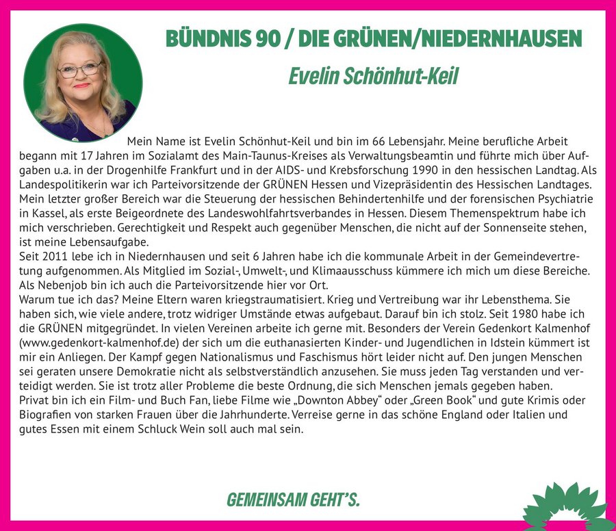Nach einer politischen Pause möchte ich meine Erfahrung gerne in die Gemeindevertretung einbringen, um Niedernhausen sozialer und grüner zu machen. Ich freue mich auf die Aufgabe.