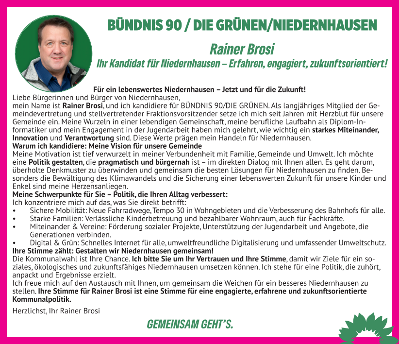Ich freue mich auf den Austausch mit Ihnen, um gemeinsam die Weichen für ein besseres Niedernhausen zu stellen. Ihre Stimme für Rainer Brosi ist eine Stimme für eine engagierte, erfahrene und zukunftsorientierte Kommunalpolitik.